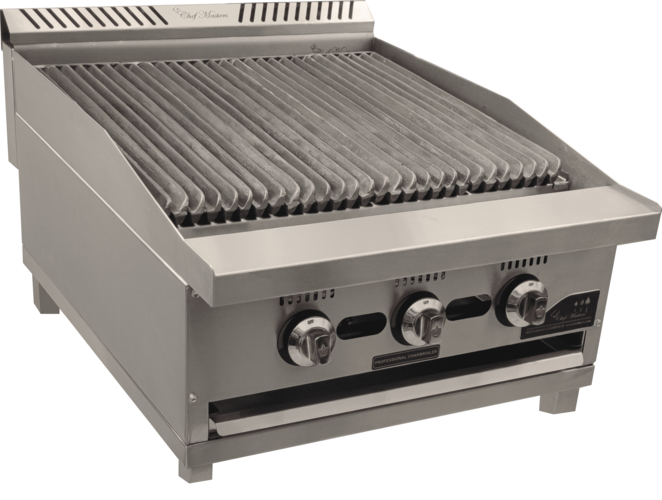 Equipos fabricados con cuerpo en acero inoxidable en el exterior con cajón deslizable para acomodarse en alturas diferentes para determinar la temperatura del asado. Las parillas asadoras se utilizan para marcar la carne, con un canal retenedor de grasa para evaporizarla y aumentar el efecto de ahumado en la carne.